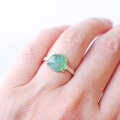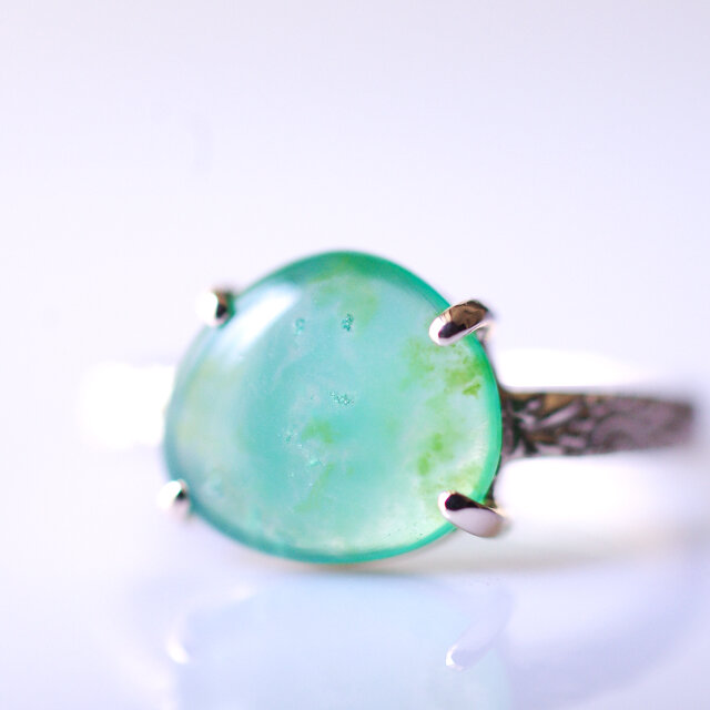 商品画像や説明の通りで、素敵なリングでした。氷ひすいの優しい色と、アームは実は仏さまがいるという、個性的なデザインに惹かれました。また、仕上げの艶消し加工が本当に綺麗です。指にスッと馴染み着け心地も良いです。たいへん気に入りました。大切にします。丁寧なご対応もありがとうございました。