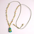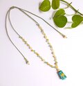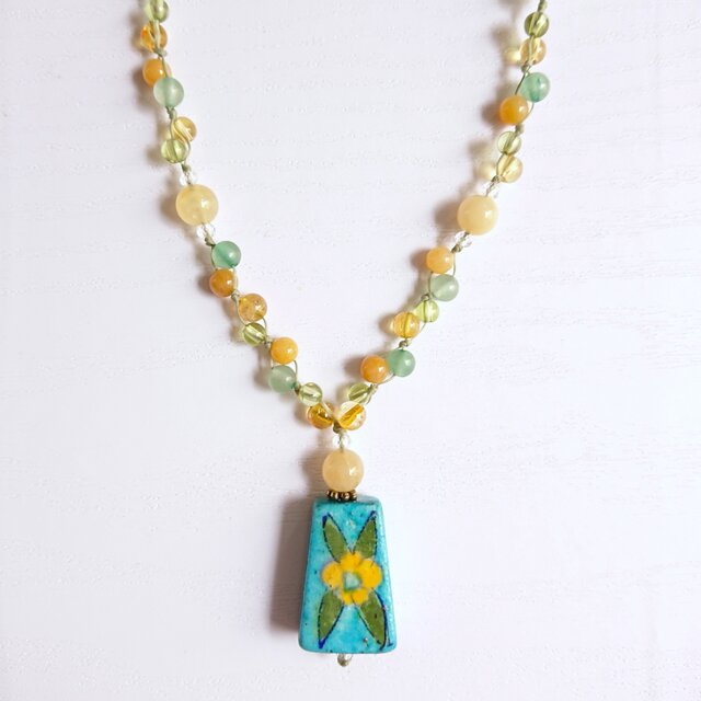 インドの陶器ビーズ「ブルーポッタリー」をトップにして、周囲に天然石を編み込んだフリーサイズのネックレスです。