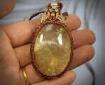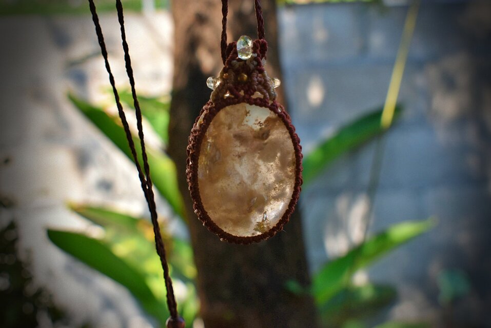 とても個性的なタイプのこのたびの水晶を石の中がしっかり見えるよう、隙間を開けて蝋引き糸で包み込み、トップをマクラメ編み装飾をして仕上げました。
