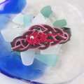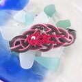 ストロベリーチョコのような色の水引の上に、赤い金魚がゆらゆらと揺れるガーリーでキュートなバレッタです。