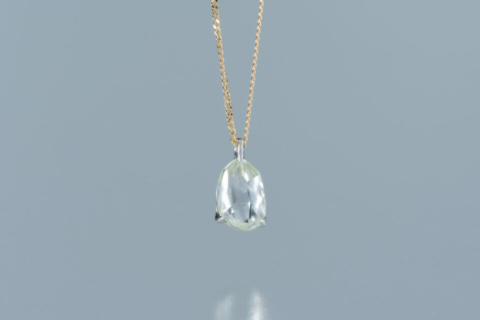淡いブルーグリーンのダイヤモンド原石をシンプルなネックレスに仕立てました。