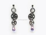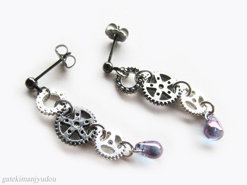 シルバーと黒ニッケルの歯車が交互に連なった下にラスターアメジスト色の雫型チェコビーズが揺れるピアスです。
