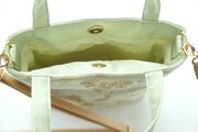 【松竹梅 花模様 ライトグリーン シルク帯リメイク 2wayショルダーバッグ&ミニハンドバッグ】スマホショルダー、結婚式にも。