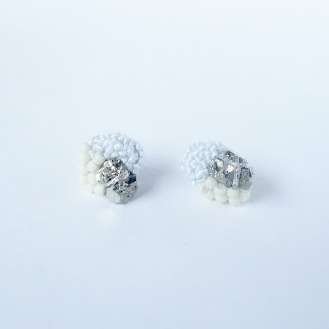 淡い色合いの刺繍の中に、パイライトの強い輝きがアクセントになっているピアスです。