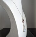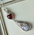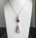 ハート型でオレンジ色を含んだ明るいレッドカラーのガーネットとクレージーレースアゲート(縞瑪瑙)を繋いで、揺れるタイプのペンダントトップに仕立てました。