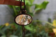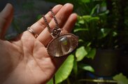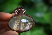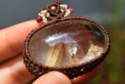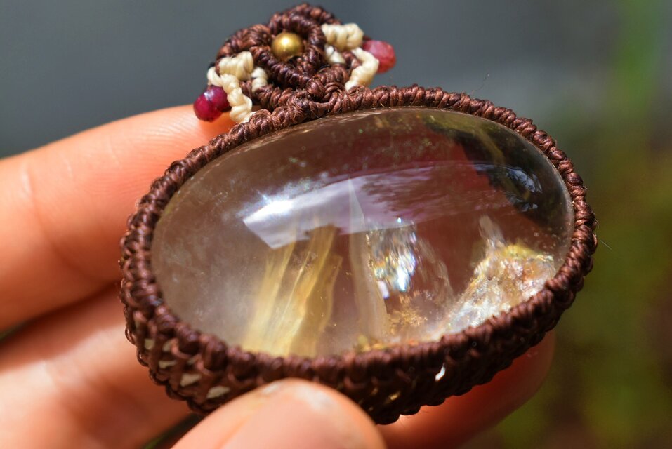 石の真ん中にぱっくりと入り込んだシラーの周りには不思議なインクルージョンと内包物が見ることができる、鋭くパワフルなガーデン水晶。キラリと七色のインクルージョンも見えます。この石の世界をより一層、見えやすい角度を考えて横向きに仕上げたマクラメ編みペンダントを制作しました。画像から見てとれますようにクォーツインクォーツとも言える世界は本当に個性的。そして、手にすると納得のボリュームが得られる水晶でもあります。