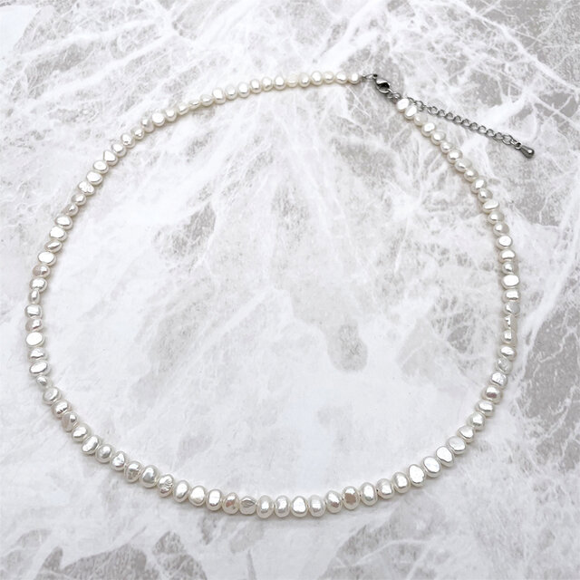 小粒パールのため華奢でシャープな印象のネックレスに仕上がっています。
