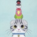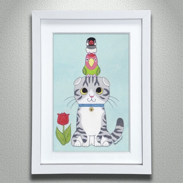 さっぽろ絵本グランプリ大賞の絵本作家・イラストレーターのヨコイマウが描く絵画「猫と花と小鳥ブレーメン」です。スコティッシュフォールドのあたまにコザクラインコと文鳥が、まるでブレーメンの音楽隊のよう乗っています。足元には可愛らしいお花(チューリップ)が咲いています。お部屋を華やかに彩る世界でたった一枚の絵画はいかがですか?