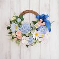 片側に濃いブルーのサテンリボンを結び、オシャレなリースに仕上げました。