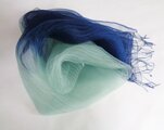 羽のように軽いシルクオーガンジー・ストールを、日本の蓼藍(たであい)で草木染めをして、さらに両端をインド藍で、濃い色になるまで藍染めを重ねました。