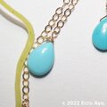 此方を通したワイヤーに、たわわに下げた桃珊瑚のパーツと、2本に下げた長目のチェーンにスリーピングビューティーのペアシェイプ、アリゾナ産スリーピングビューティーのラウンドを4個下げ、一番下に桃珊瑚のラウンドをアクセントになるように下げ、一番下にペアシェイプを下げました。