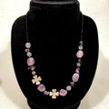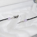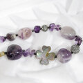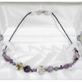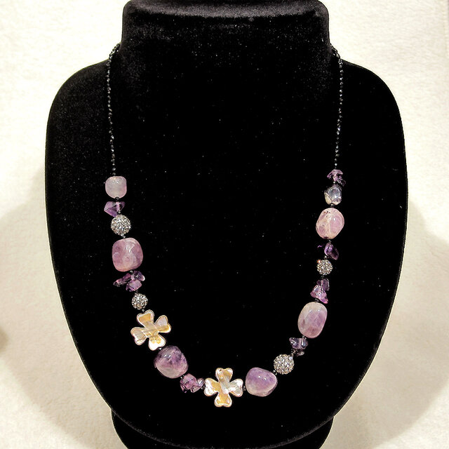 ぷっくりとしたケープアメシスト、メタリックな輝きのアバロンシェル(アワビ貝)、透明感のあるパープルのさざれのアメシスト、きらきらと細かに輝くブラックスピネルを使った、ブラックとの相性の良いネックレスです。南洋真珠のネックレスなどの高級宝飾品に使われる輝きが特に綺麗なボールも使っています。