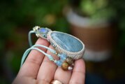 ◆このたびはホワイト、ミント、ブルー、ピンク、ナチュラルホワイト、ピーコックグリーン色の蝋引き糸を使用しマクラメ編み装飾を施しました。