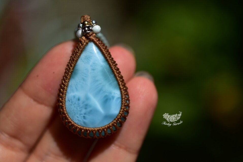 ◆このたびはゴールドブラウン、ミント色の蝋引き糸を使用しマクラメ編み装飾を施しました。