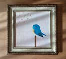 淡いピンクの背景の中で、青い鳥が希望を見ています。