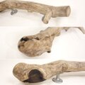 枝分かれの流木、反対側の端や側面や裏面3か所に 木の皮の 大きな裂けがあり、その中は濃いこげ茶色が見えています。大胆な裂け目には見ごたえがあります。