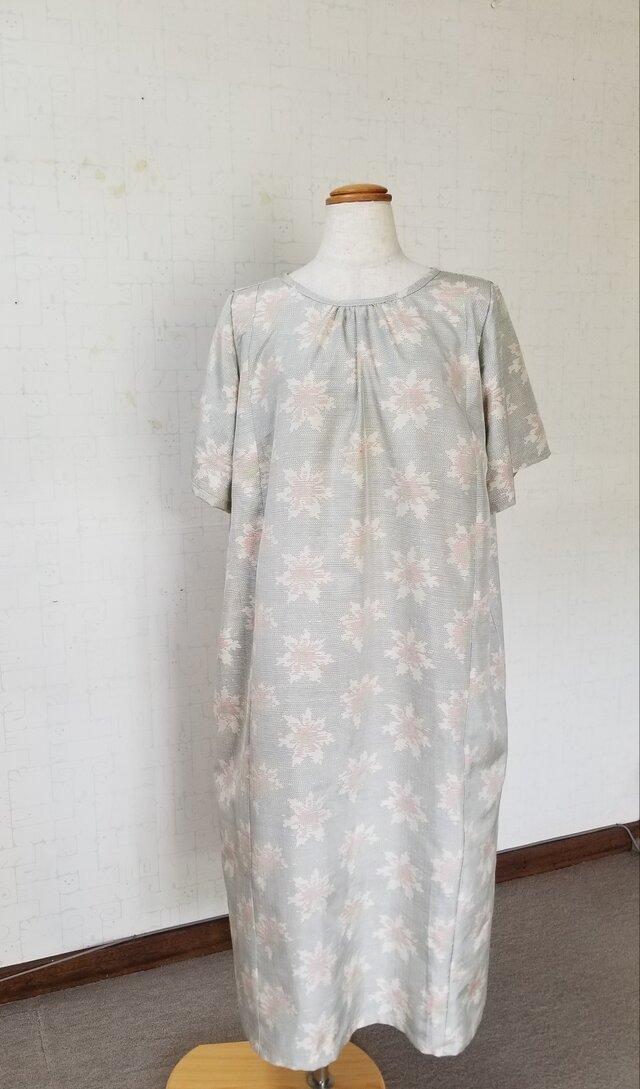 大きいサイズ 大島紬リメイク 前襟ぐりギャザーワンピース