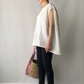 ・ボトムのウエストに前中心裾または、脇裾をちょっとだけ入れ込んで、丈バランスを調整して楽しむこともできます。