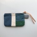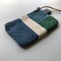 くすんだ青2色 × 生成り色 × くっきり緑緑色の4色のコットン帆布生地で小さなポーチを制作致しました(青2色・緑は8号帆布、生成りは6号帆布)