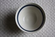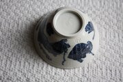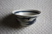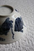 外側に呉須で大柄な模様が描かれ、経線のような縦筋が彫られています。