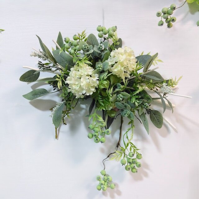 ライフラワーの白い小枝がベースのスワッグです。