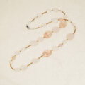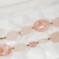 ストロベリークォーツ、ローズクォーツ、本真珠(淡水パール)、ロードクロサイト、ヘソナイトガーネットの天然石ロングネックレスです。ローズクォーツはリーフモチーフにカットされたものも使っています。真珠の色合いはナチュラルカラーです。