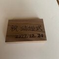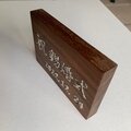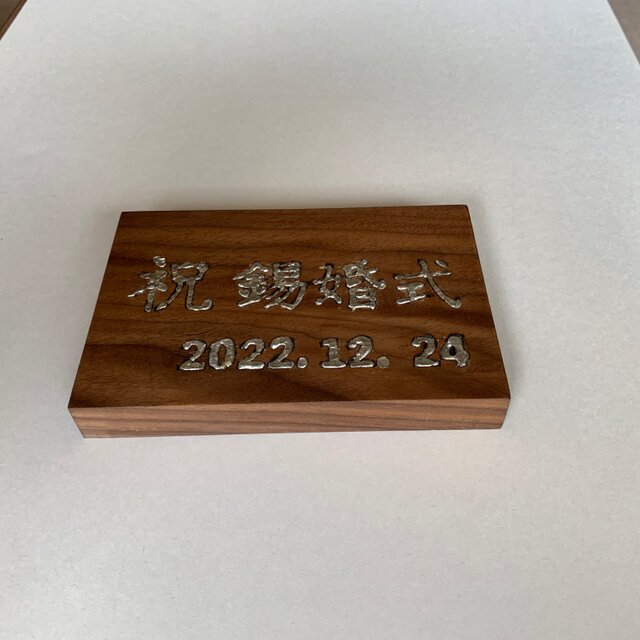 無垢材を彫り込み、文字として錫を埋め込んだ、銀婚式の記念盾です。