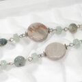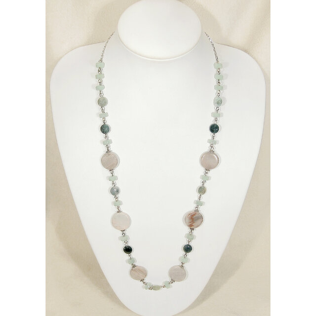 円柱にカットされたアベンチュリンなどの天然石を使ったロングネックレスです。