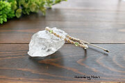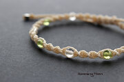 透明感と明るいグリーンが美しいペリドットをセレクトし、カット入りの水晶と共にアイボリーホワイトのコードで繋ぎました。
