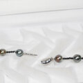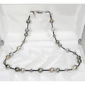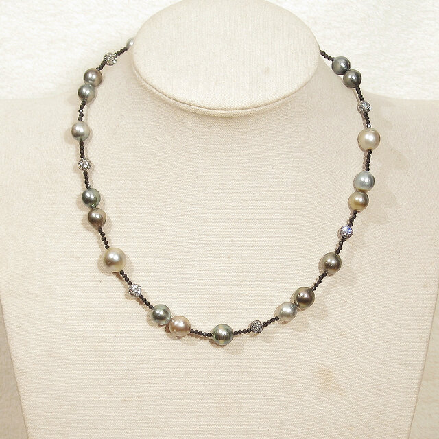 照りの美しいマルチカラーの南洋真珠と、細かに輝く小粒のブラックスピネルのネックレスです。