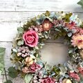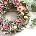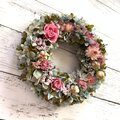 プリンセスピンクのプリザーブドのバラにドライの帝王貝細工、対してグリーンボルドーやブルーライムなどの枯れ感のある落ち着いたアジサイで包んだリースです。