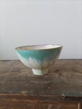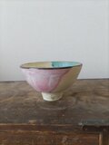 3種類の釉薬を掛けた陶器の茶碗です。混ざりあった釉薬の色合いが綺麗です。