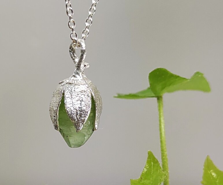 白い花が咲き誇った夏、実を付けた秋、種を落とした冬。。そしてまた*沙羅樹(シャラノキ)夏椿の実(殻)を銀に置換鋳造したもので茎を丸めてバチカンに形状を活かした石留めをしております*高い技術と培った勘が必要な現物鋳造、型取りせずひとつひとつ銀に変身した一点モノ(耐久性は銀製品そのもので丈夫です)役目を終えた小ぶりな殻にはペリドット原石を抱いてもらいました*夏椿は仏教聖樹である沙羅双樹に似ていることから沙羅樹(シャラノキ)とも呼ばれます*通常、黒化遅延処理を施しますが銀そのものの変化をお好みの場合は処理不要とお申し付けください*黒化防止ロジウムコーティングご希望の場合はチェーンとともに承ります(別途1500円)