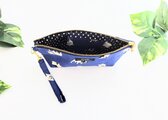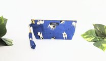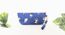 ブルー色の綿リネン生地に可愛いフレンチブルドッグ柄の少し大きめサイズの持ち手付きペンケースです。
