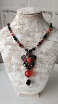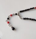 トップ部分は銀糸の施された漆黒の花刺繍に天然石のオニキスやガーネット、赤メノウや水晶などを繊細に組み上げ、ジェットブラックと深紅のチェコグラスをネック部分に配し、情熱的ながらもシックな存在感溢れるネックレスに仕上げました。