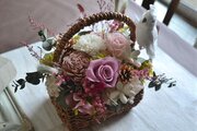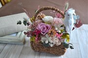 手つきのパニエにたくさんの花々と