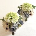 ◇淡いグリーン系のダリアの足元に、アイボリーと淡いグリーンとブルーのお花を敷き詰めた、爽やかでとっても涼しげな、清楚な印象の上品な仏花になりました。