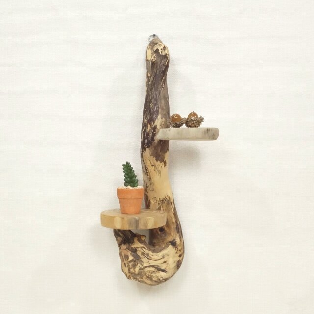 柱の流木にミニ丸太流木を取り付けた、かわいい飾り棚です。
