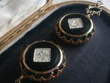 こちらの蝶のGlassをオーストリア製ヴィンテージSW、漆黒のGlassが1周している台座(約22㎜)にお留め致しました。約4㎜ほどの漆黒Glassが16粒おさめられております。