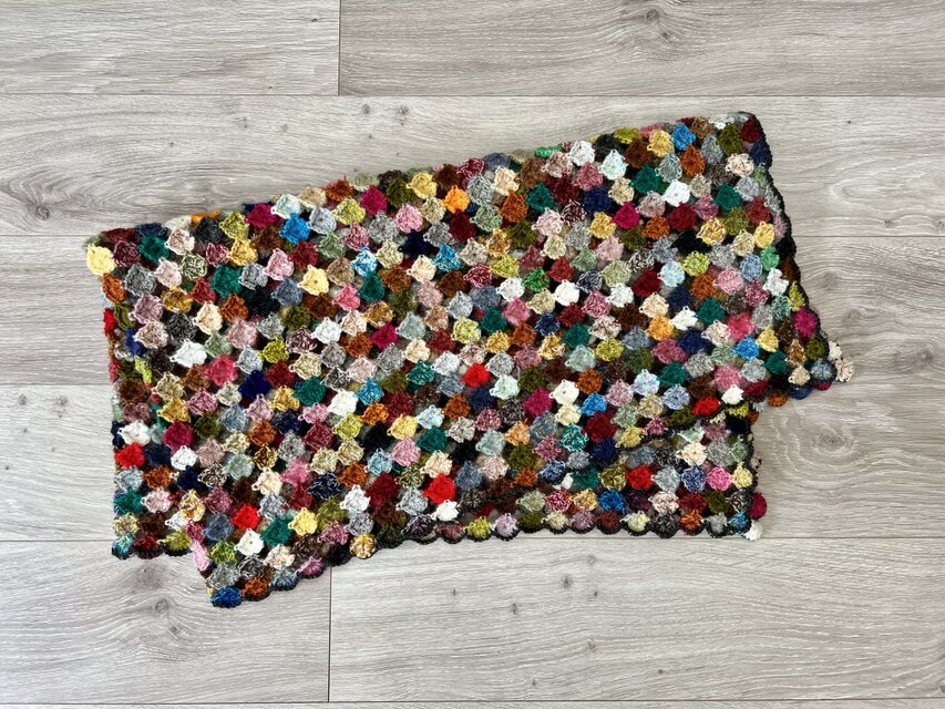 小さな丸モチーフを繋げたブランケットです。