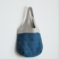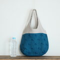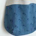 藍の型染めでリネン生地に花柄を染め、丸いトートバッグをつくりました。下地の青色も藍染めです。