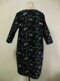 黒地×白線ねこ柄プリント ラウンドネック7分丈袖ワンピース 両脇ポケット付き LLサイズ 受注生産