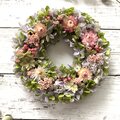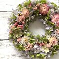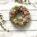 ドライフラワーの帝王貝細工やライスフラワー、アジサイなどをパステルカラーにまとめたミニリースです。