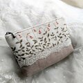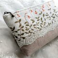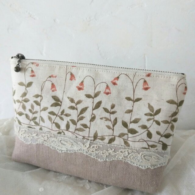 生成りに優しいタッチで描かれたつる草プリントとベージュリネンを組合せたポーチです。
