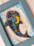 ガラス絵の具で薄いアクリルに花火模様のジンベイザメの絵を描きました^^縦にも横にも置けるデザインです!