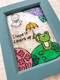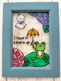 ガラス絵の具で薄いアクリルに紫陽花、カエル、てるてる坊主の絵を描きました^^