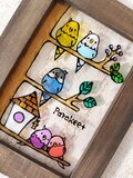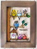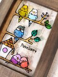 ガラス絵の具で薄いアクリルにインコとおうちの絵を描きました^^ 色違いでホワイト系も♪