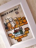 ガラス絵の具で薄いアクリルに可愛らしい犬の背中とレンガの壁の絵を描きました^^ フレームはホワイト系です。真っ白ではありません。
