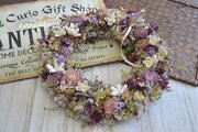シックな紫をアクセントに花だくさんにまとめたリース。