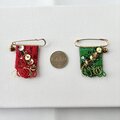 (こちらの鈴は音が鳴る素材になります) 鈴は丸カンに通してあり、赤いブローチタイプと異なり自由に動きます。動く範囲をお好きな位置で固定できますよう付属のゴールドキャッチを移動していただければと思います。